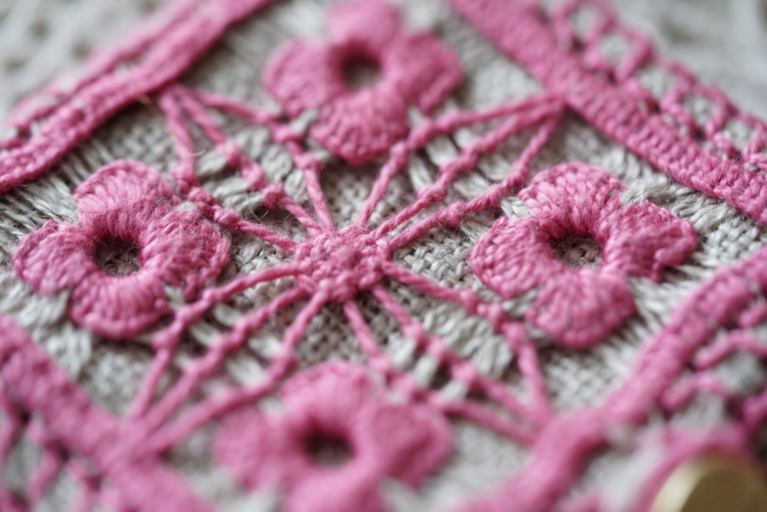 粗目の麻布に縁の部分を刺し、内側の織り糸を寄せたり刺繍糸でかがって花のモチーフを作っていきます。
